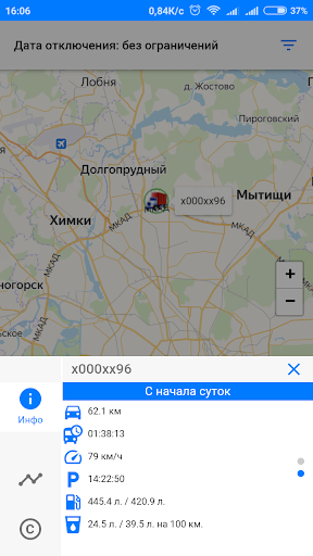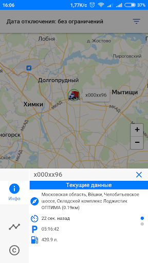 Отображения местоположения транспортных средств (ТС) на карте в режиме реального времени, текущих и суточных эксплуатационных показателей ТС;