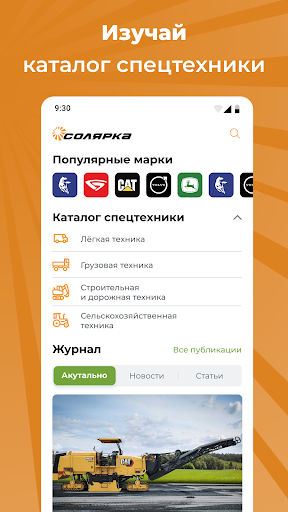 В Солярке вы найдете как отечественные машины, так и широкий ассортимент иностранной спецтехники. Приложение предлагает широкий выбор различных моделей и комплектаций на всю спецтехнику из каталога. А также огромный выбор деталей для обслуживания и ремонта.