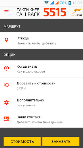 Приложение для вызова такси Кенгуру 5515 – оптимальное для заказа такси онлайн в Киеве. Начиная со второго заказа в Вашем смартфоне будет очень быстрое приложение, в котором можно заказать машину за 30 секунд. А если Вы повторите свой предыдущий маршрут (один из предыдущих, обозначенных звездочкой, то и за 5 секунд). Если не верите – скачайте наше приложение недорогое Kenguru такси 5515 и сделайте заказ.