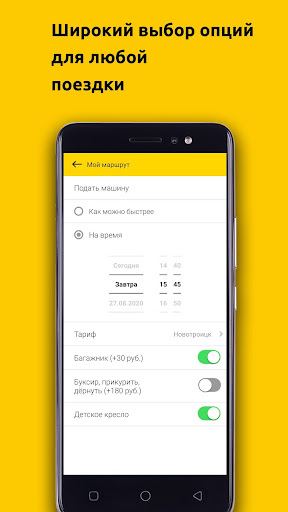 Широкий набор опций позволяет подобрать автомобиль по вашим предпочтениям. Например, можно сделать заказ на определённое время или найти ближайший автомобиль, оборудованный детским креслом.