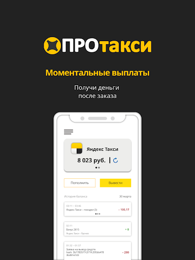 Мы сделали наше приложение для водителей Яндекс.Такси, Uber такси и курьеров удобнее, чтобы вы могли вывести денежные средства себе на карту моментально, без запроса менеджеру Яндекс ПРО и ожидания расчётного периода и ночью, и в праздники.
