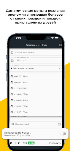 Выбирайте маршрут из списка предложенных, и вы увидите полный график выездов с местами отправления и прибытия, а также все тарифы и спецпредложения, доступные на этом маршруте. Например, на маршруте «Омск – Петропавловск» действует динамическое ценообразование. Что это значит? Чем раньше вы бронируете поездку, тем дешевле ее стоимость.