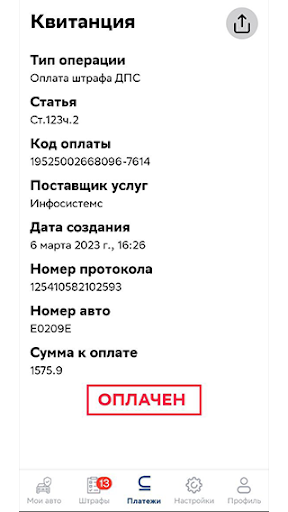 • Отображение статуса штрафа