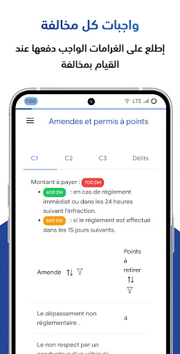 كما يوفر التطبيق للمستخدمين إمكانية الإطلاع على الدليل الخاص بمخالفات قانون السير والذي يحتوي على كافة درجات المخالفات والنقط التي تخصم بالنسبة لكل مخالفة.