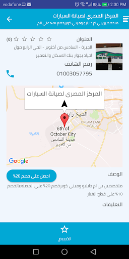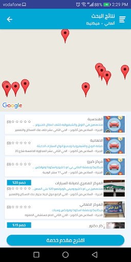 بعد ظهور نتائج البحث وبالضغط على اى نتيجة بحث يظهر تفاصيل مقدم الخدمة لصاحب السيارة