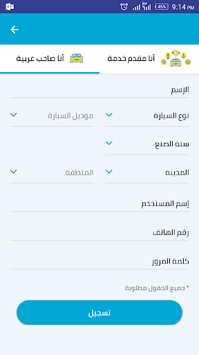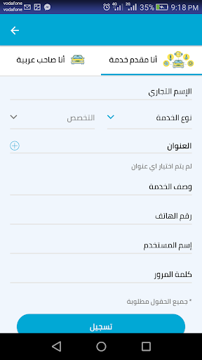 مقدم الخدمة: يقوم مقدم الخدمة بالتسجيل فى التطبيق وذلك بادخال بياناته مثل (الاسم التجارى للورشة او الخدمة , العنوان , وصف الخدمة , التليفون , الخ..)