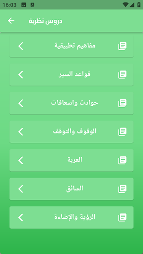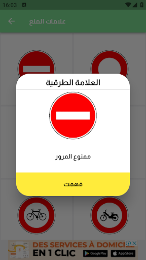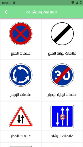 2. إشارات المرور: يوضح التطبيق جميع الإشارات المرورية بما في ذلك الإشارات الأساسية والإضافية وإشارات شرطة المرور وإشارات المرور الخاصة.