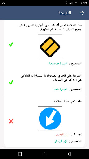 في التطبيق ايضا قسم خاص باختبار اشارات المرور في مصر، حيث يوجد مجموعة اسئله تشبه اسئلة اختبار القياده في المرور ، الاسئله تعرض بطريقة تعليمية سهلة مرحة كما انها تعرض نتائج الاختبار مع عرض الاجابات الصحيحة في حال كانت اجابتك خطأ،