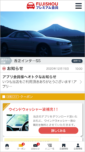 当社の公式アプリ「【公式】FUJISHOUプレミアム会員」ではアプリで簡単に洗車・コーティングなどのご予約や愛車のメンテナンス管理が可能の他、当店で利用いただけるお得なクーポンや各種メニューの割引情報を配信しております。