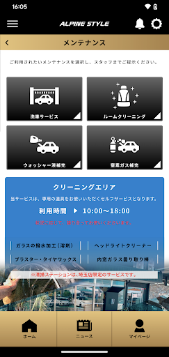 洗車サービス、ルームクリーニング、ウォッシャー液補充、窒素ガス補充、クリーニングエリアをアプリのメンテナンス機能からご利用することができます。
