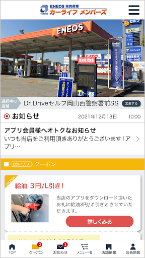 「いつも近くに」をモットーに、いつでもお客様の愛車をサポートできるよう幅広いサービスを提供しており、当社のアプリ「カーライフメンバーズ」なら「もっと便利に!」「もっとお得に!」地域のみなさまののカーライフをサポートすることが可能です。