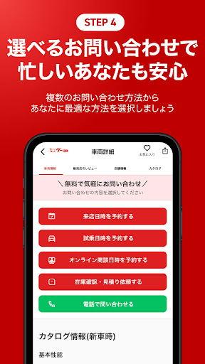 日々更新されるデータベースから これだ!という納得の中古車に出会えたらすぐに販売店に見積り、お問い合わせしましょう。