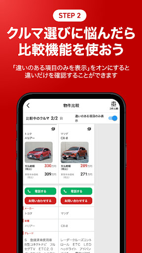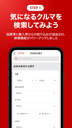 累計600万ダウンロードを超え、日本最大級の掲載台数、全国約50万台の中古車を扱う中古車検索サービス、