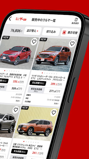 車両一覧の絞込みで、価格帯の条件で予算を指定したり、年式(初度登録)、走行距離、修復歴の有無など