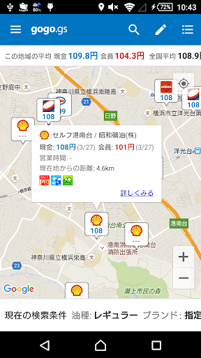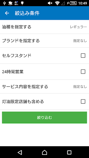 ・ガソリンスタンド検索の細かい検索条件の設定をすることができます。(レギュラー、ハイオクなどの油種指定。ENEOSやESSOなどのブランド指定。セルフ給油のガソリンスタンドの指定。24時間営業のガソリンスタンドの指定。洗車やオイル交換などの給油以外のサービスがあるガソリンスタンドの指定)