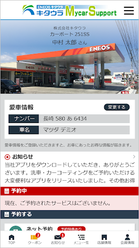 当社の公式アプリ「キタウラ Mycar Support」では簡単な手続きだけでお手軽に洗車・コーティングなどのご予約や愛車のメンテナンス管理が可能です。その他、ご登録いただいた店舗で利用いただけるお得なクーポンや各種メニューの割引情報を随時配信していますので、お気軽にご活用ください!