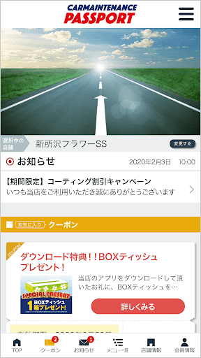 車検・カーコーティングなどのご予約や、愛車のメンテナンス管理ができるアプリです。