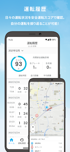 日々の運転履歴を確認できます。出発/到着地点や時刻、運転時間、走行距離などの運転情報を表示します。急発進や急ブレーキの回数をもとにした月々の「安全運転スコア」も表示できます。
