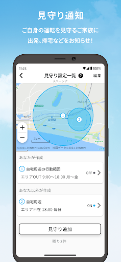 家族など身近な人を「みまもるユーザー」として招待して、スマートフォンに運転状況を通知する機能です。エリアと時間を設定しておくと、「出発(設定エリアから出た)」「帰宅(設定エリアに入った)」「いつもの帰宅時間に不在(設定時間に設定エリアにいない)」をお知らせすることができます。