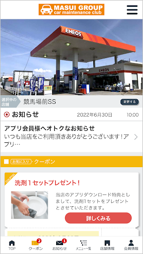 当社の公式アプリ「マスイカーメンテクラブ」ではアプリで簡単に洗車・コーティングなどのご予約や愛車のメンテナンス管理が可能の他、当店で利用いただけるお得なクーポンや各種メニューの割引情報を配信しております。