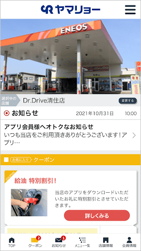 お客様に快適なカーライフをお過ごしいただけるよう、公式アプリ「ヤマリョー株式会社 SSアプリ」を通じてさまざまなサービスを提供いたします。