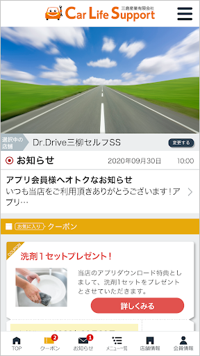 当社のアプリ「三島産業カーライフサポートアプリ」ではアプリで簡単に洗車・コーティングなどのご予約や愛車のメンテナンス管理が可能の他、ご登録いただいた店舗で利用いただけるお得なクーポンや各種メニューの割引情報を配信しております。