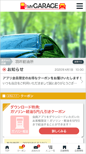 当社のアプリ「上田石油(株) My Garageアプリ」ではアプリで簡単に洗車・コーティングなどのご予約や愛車のメンテナンス管理が可能の他、ご登録いただいた店舗で利用いただけるお得なクーポンや各種メニューの割引情報を配信しております。
