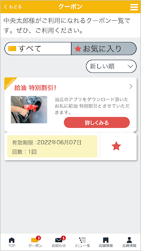 当社のアプリ「中央石油 Car Life Support」ではアプリで様々なサービスの管理が可能の他、ご登録いただいた店舗で利用いただけるお得なクーポンや各種メニューの割引情報を配信しております。