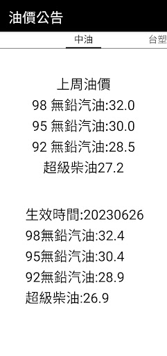 油價公告是一個方便的工具,提供用戶即時查看中油、台塑油價資訊的功能。使用者可以透過此應用程式快速查詢最新的油價資訊,並隨時了解油價的變動情況。
