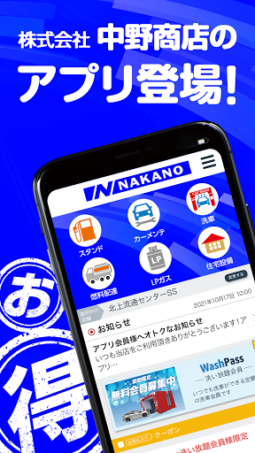 当社の公式アプリ「中野商店」ではWashPass(セルフ洗車機 洗い放題会員)のお申し込み・お支払い・ご利用いただけます。またアプリにて当店で利用いただけるお得なクーポンや各種メニューの割引情報を配信しております。