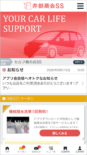 当社の公式アプリ「井部商会SS」ではアプリで簡単に洗車・コーティングなどのご予約や愛車のメンテナンス管理が可能の他、当店で利用いただけるお得なクーポンや各種メニューの割引情報を配信しております。
