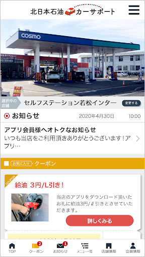 当社のアプリ「北日本石油 カーサポート」ではアプリで簡単に洗車・コーティングなどのご予約や愛車のメンテナンス管理が可能の他、ご登録いただいた店舗で利用いただけるお得なクーポンや各種メニューの割引情報を配信しております。