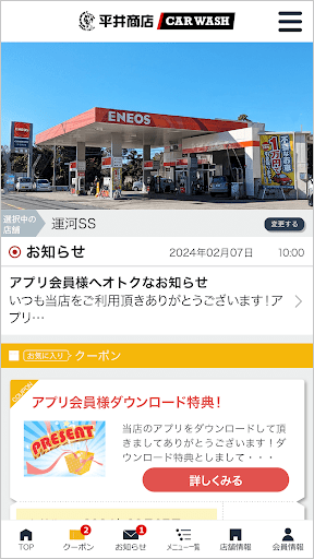 当社の公式アプリ「平井商店 洗車アプリ」ではアプリで洗車サービスのご利用が可能の他、当店で利用いただけるお得なクーポンや各種メニューの割引情報を配信しております。
