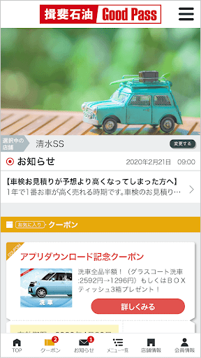 当社のアプリ「揖斐石油グッドパス」ではアプリで簡単に洗車・コーティングなどのご予約や愛車のメンテナンス管理が可能の他、ご登録いただいた店舗で利用いただけるお得なクーポンや各種メニューの割引情報を配信しております。