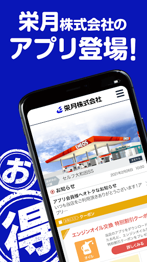 当社の公式アプリ「栄月アプリ」は、アプリからお気軽に愛車のメンテナンス管理ができるほか、ご登録いただいた店舗でご利用いただけるお得なクーポンや各種メニューの割引情報を配信しております。