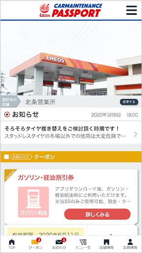 当社のアプリ「植田石油カーメンテナンスアプリ」ではアプリで簡単に洗車・コーティングなどのご予約や愛車のメンテナンス管理が可能の他、ご登録いただいた店舗で利用いただけるお得なクーポンや各種メニューの割引情報を配信しております。