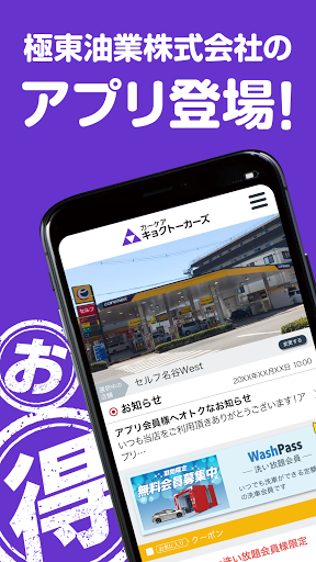 当社の公式アプリ「極東油業 キョクトーカーズ」ではWashPass(セルフ洗車機 洗い放題会員)のお申し込み・お支払い・ご利用いただけます。またアプリにて当店で利用いただけるお得なクーポンや各種メニューの割引情報を配信しております。