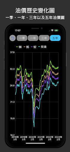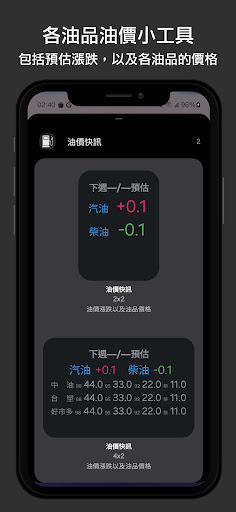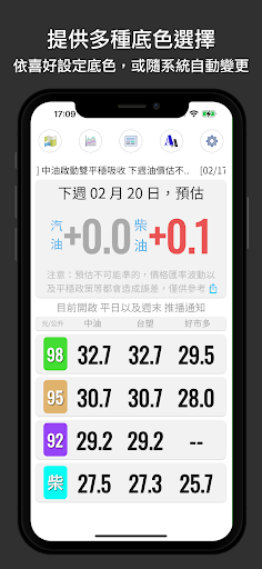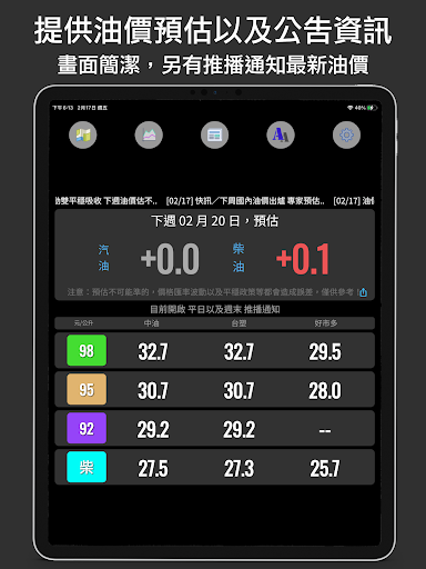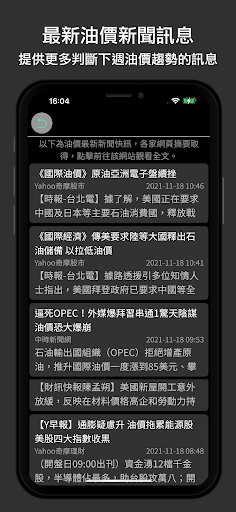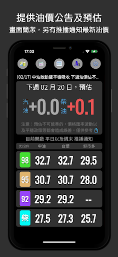 提供台灣油價公告、油價預測、歷史油價圖、推播通知、附近加油站以及基本天氣資訊