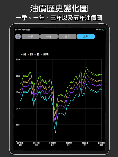歷史油價:提供三週、一年、三年以及五年的歷史變化。