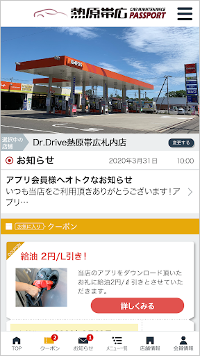当社のアプリ「熱原帯広カーメンテパスポート」ではアプリで簡単にコーティングなどのご予約や愛車のメンテナンス管理が可能の他、ご登録いただいた店舗で利用いただけるお得なクーポンや各種メニューの割引情報を配信しております。