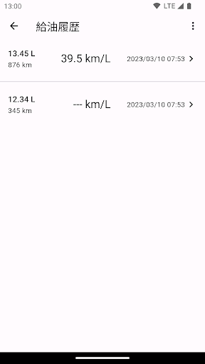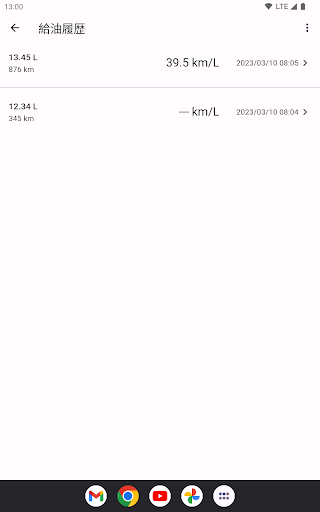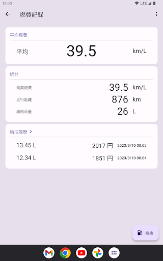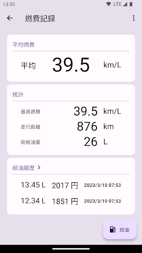 過去の給油履歴をさかのぼり,最高燃費や総給油量を確認できます.