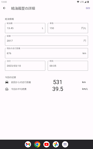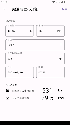 自動車に燃料を給油する際,給油量とその時点での走行距離,燃料の単価と総額を記録できます.また,記録された情報から燃費を計算し,記録します.
