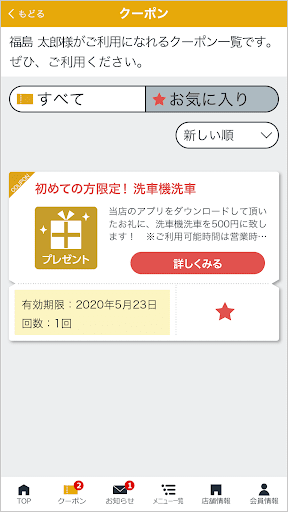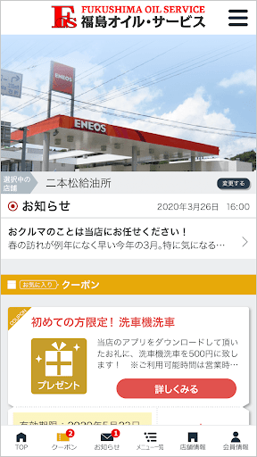 当社のアプリ「福島オイル・サービス」ではアプリで簡単に洗車・コーティングなどのご予約や愛車のメンテナンス管理が可能の他、ご登録いただいた店舗で利用いただけるお得なクーポンや各種メニューの割引情報を配信しております。
