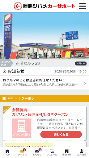 当社の公式アプリ「置賜ツバメ石油カーサポートアプリ」ではアプリで簡単に洗車・コーティングなどのご予約や愛車のメンテナンス管理が可能の他、ご登録いただいた店舗で利用いただけるお得なクーポンや各種メニューの割引情報を配信しております。