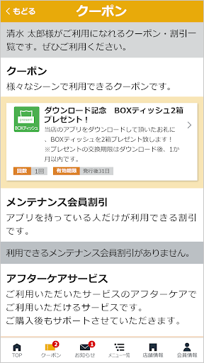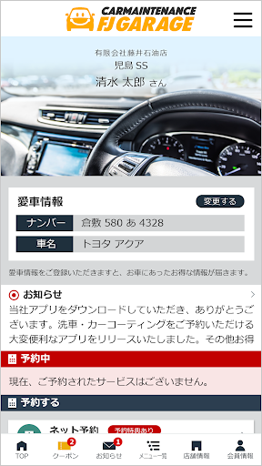 当社の公式アプリ「藤井石油店」ではアプリで簡単に洗車・コーティングなどのご予約や愛車のメンテナンス管理が可能の他、当店で利用いただけるお得なクーポンや各種メニューの割引情報を配信しております。