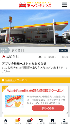 当社のアプリ「西崎石油 車のメンテナンス」ではWashPass(セルフ洗車機 洗い放題会員)のお申し込み・お支払い・ご利用いただけます。またアプリにて当店で利用いただけるお得なクーポンや各種メニューの割引情報を配信しております。