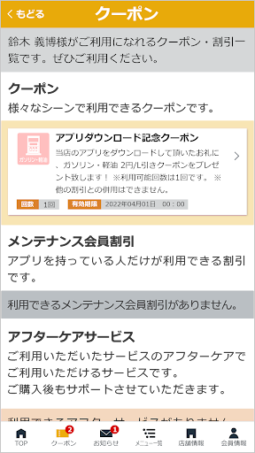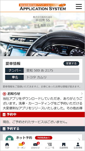 当社の公式アプリ「飯田石油店 アプリケーションシステム」ではアプリで簡単にカーメンテナンスの予約や愛車情報の管理が可能です。その他、当店で利用いただけるお得なクーポンや各種メニューの割引情報を配信しております。