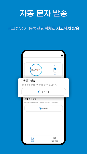 4. 바통TOUCH 스스로 시스템: 교통사고로 인해 의식이 없을 시에도 바통TOUCH 휴대폰 사고감지를 통해 즉시 119응급구조센터에 응급구조를 요청합니다. 또한 사용자가 미리 등록해놓은 비상연락망으로 응급구조 요청 문자가 전송됩니다.
