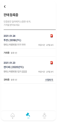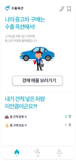 중고차를 팔 때 다수의 딜러 및 수출업자에게 빠르게 견적을 받아 볼 수 있는 역경매 시스템 중고차 딜러용 앱으로 구매자가 견적을 받을 수 있는 앱은 ‘수출옥션’을 다운로드하셔서 진행하시면 됩니다.