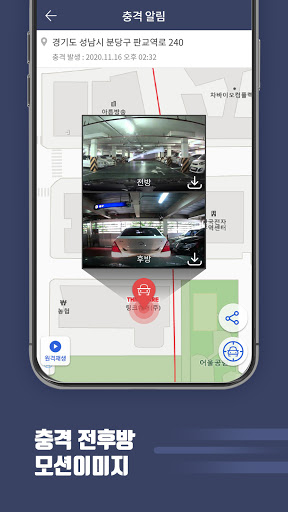 주차모드 시 차량에 충격이 발생한 경우 사고의 위치와 함께 사고 당시의 상황을 전후방 고화질의 모션 이미지로 제공하여 보다 확실하게 사고 상황을 파악하고 증거를 확보하여 신속한 사고처리에 도움이 될 수 있어요.